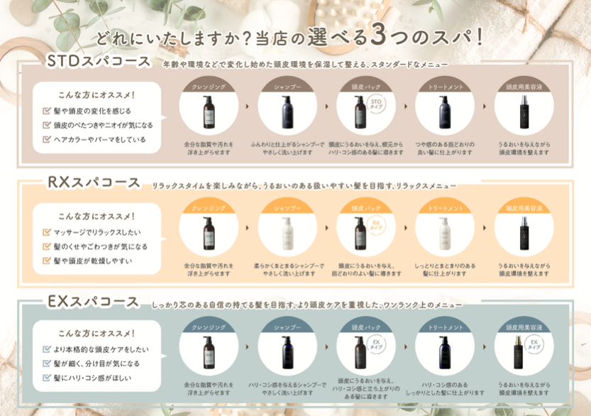 10種類のアロマオイルも用意しており、ヘッドスパクリームに添加することでヘッドスパコースに幅が持たせることが可能です!